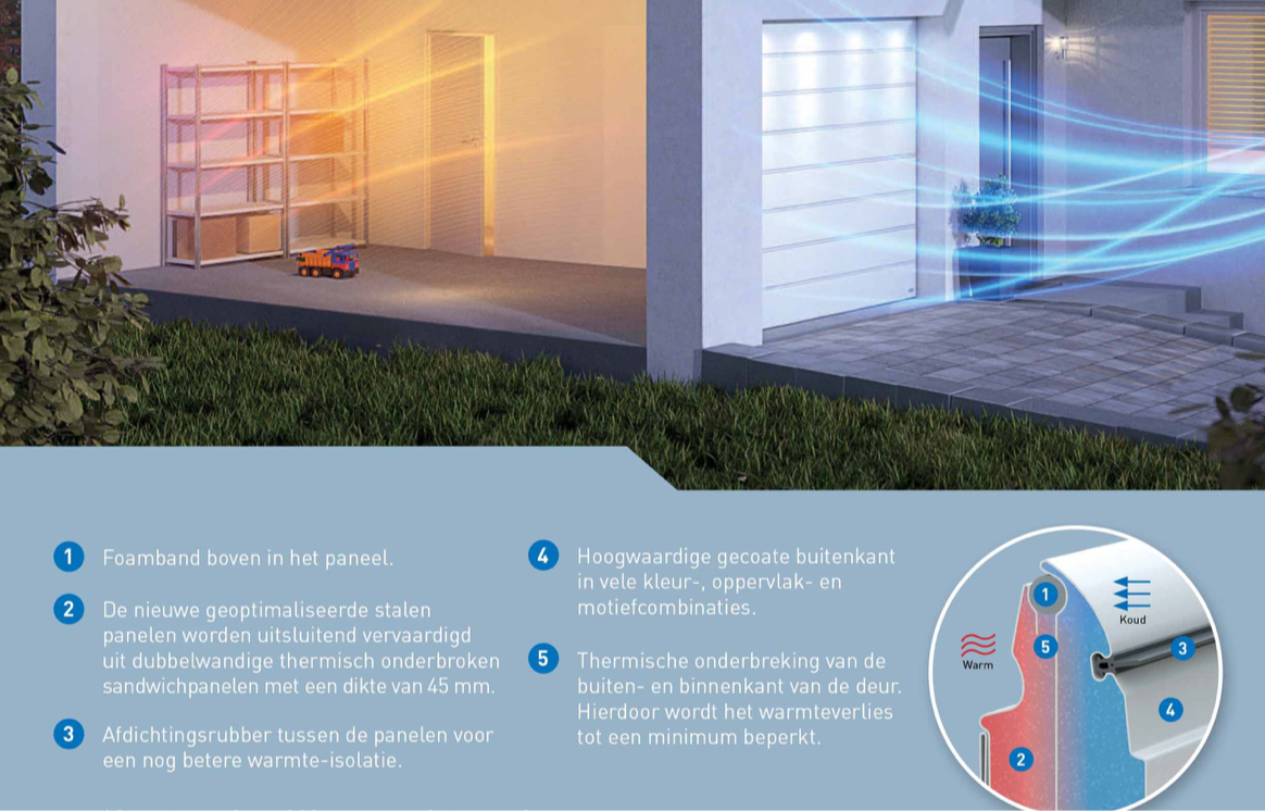 Dit is uniek voor garagedeuren en maken dat u met een Novoferm garagedeur een optimale isolatie van uw garage kunt bereiken, De panelen hebben een PUR hardschuim kern en een extra afdichting tussen de panelen. Het vernieuwde vloerprofiel aan de onderkant van de deur compenseert kleine oneffenheden in de vloer tot 10 mm. Hierdoor wordt het warmteverlies tot een minimum beperkt.